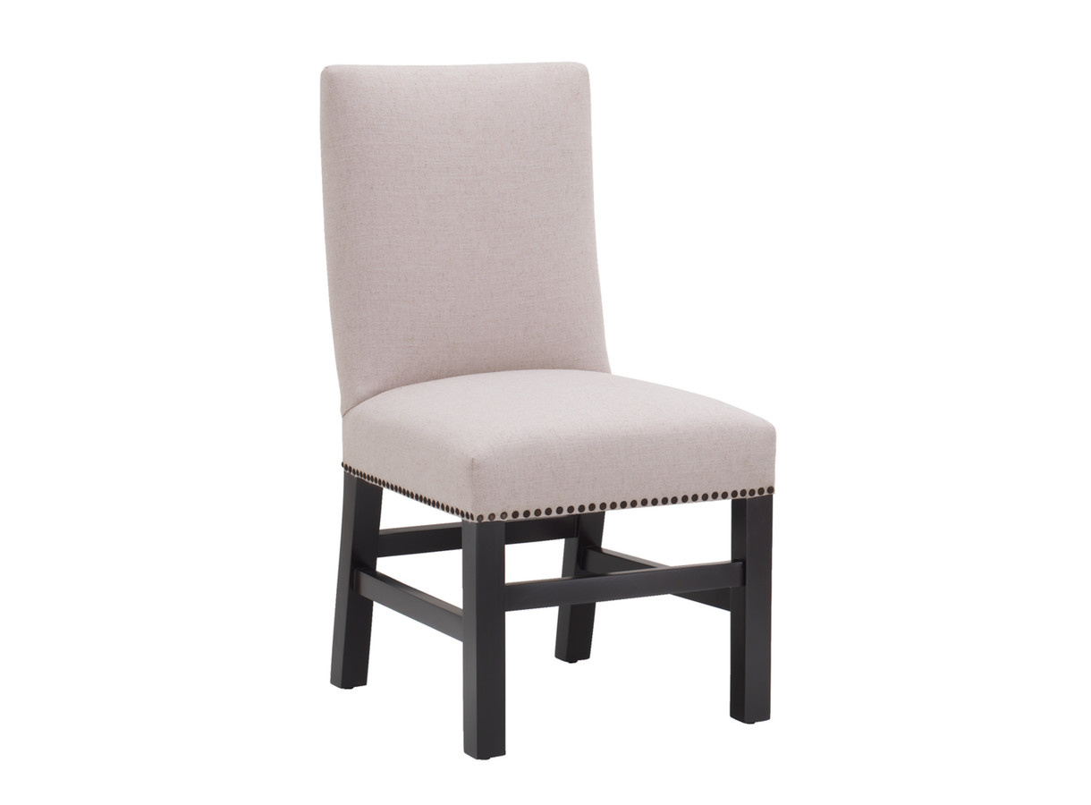 This is our contemporary high back dining chair. It is supported by 14.5" legs & rails available in all of our finishes. We trimmed it out with nailheads at the base.