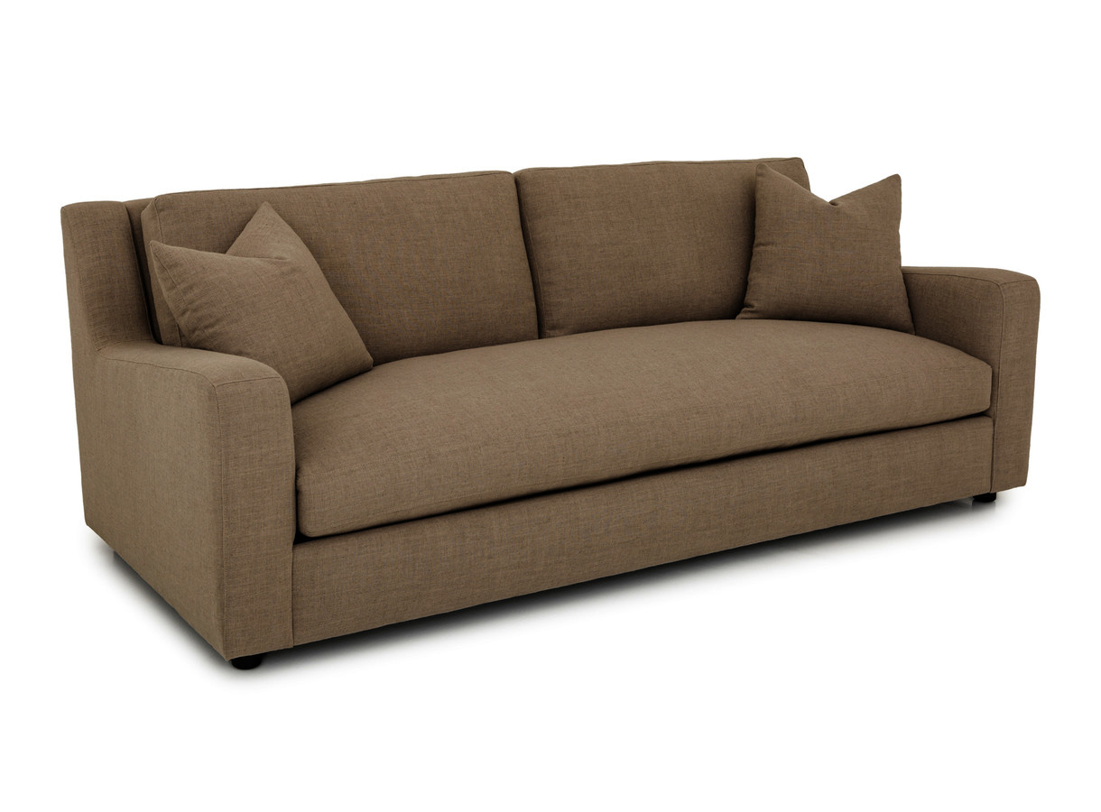 Our olympus has a raised arm in the front that slopes back. The lines are very clean and contemporary. It is shown with a bench seat cushion, 2 back cushions and 2 throw pillows are included.