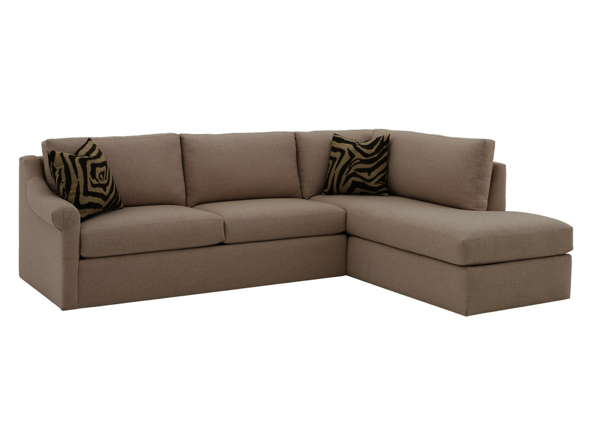 This transitional style has an 8" round arm that slopes down from the back. It is upholstered to the floor and offers 2 back cushions over 2 seat cushions.