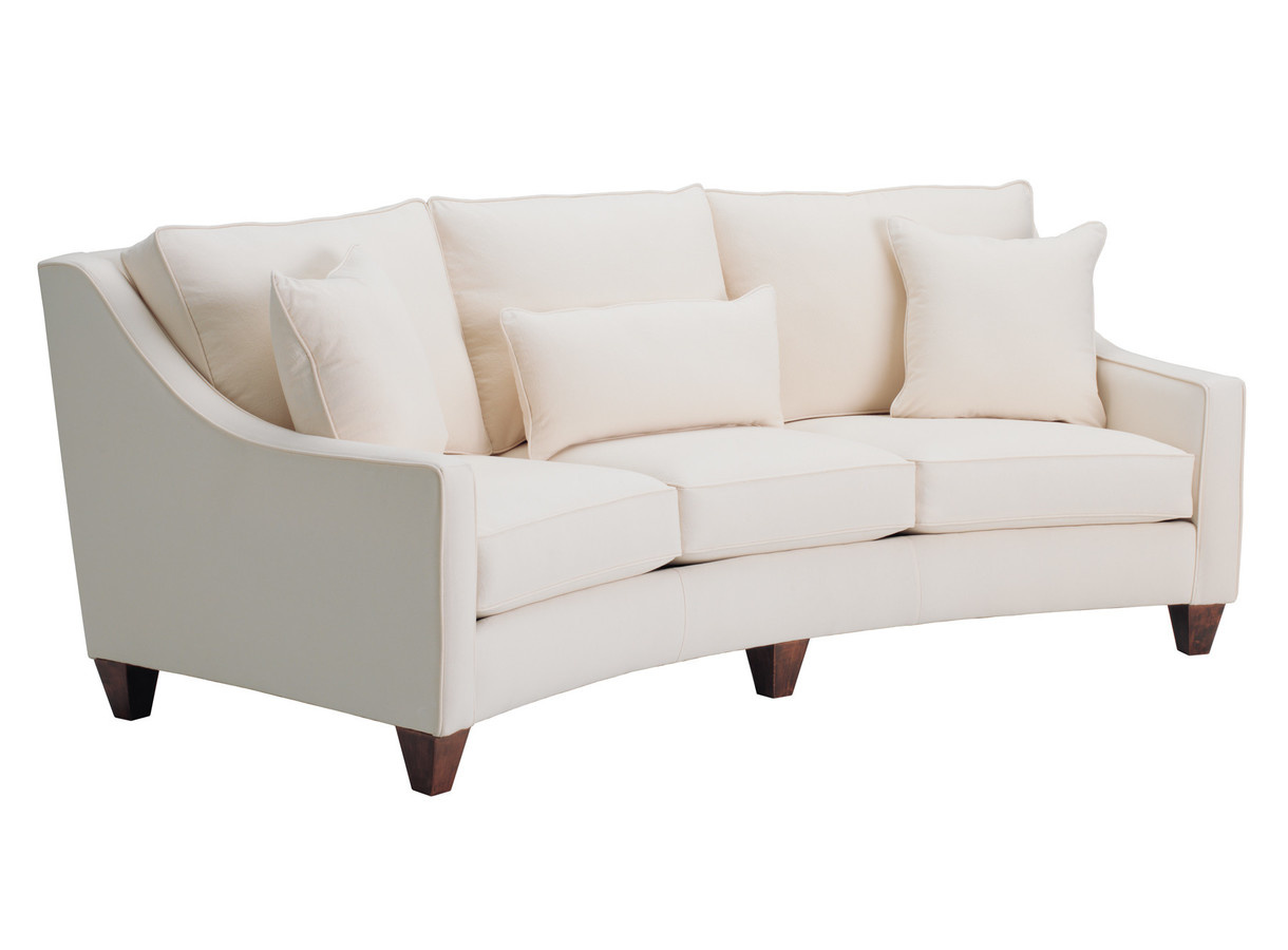 Our sandy style has a dropped arm that curves to the front. We show it as a straight 86", 2-arm sofa. It is also available as a curved sofa. The back cushions are 3 over 3 seat cushions with welting throughout.