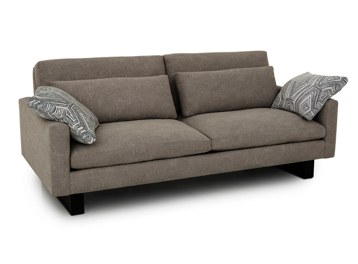 This contemporary style has a solid wood plynth base. With 5.5" wide track arms, it appears to be floating. It has 2 rows of back pillows to compensate for the 42" depth.