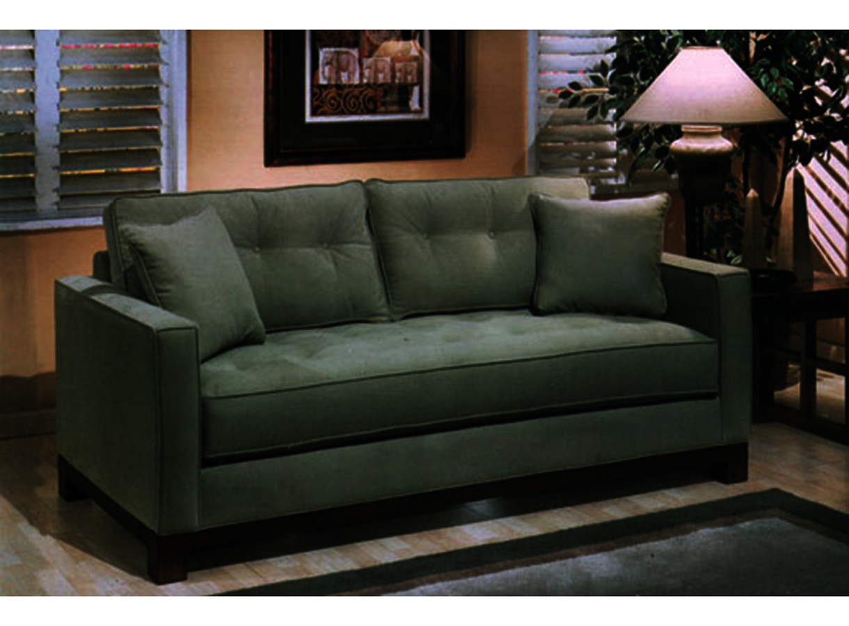 Our structure is a clean, contemporary style with 5.5" track arms. We show it with a button tufted bench seat cushion and 2 fiber fill back cushions. It is on the showroom floor with a queen size sleeper with a dream air mattress and pump.