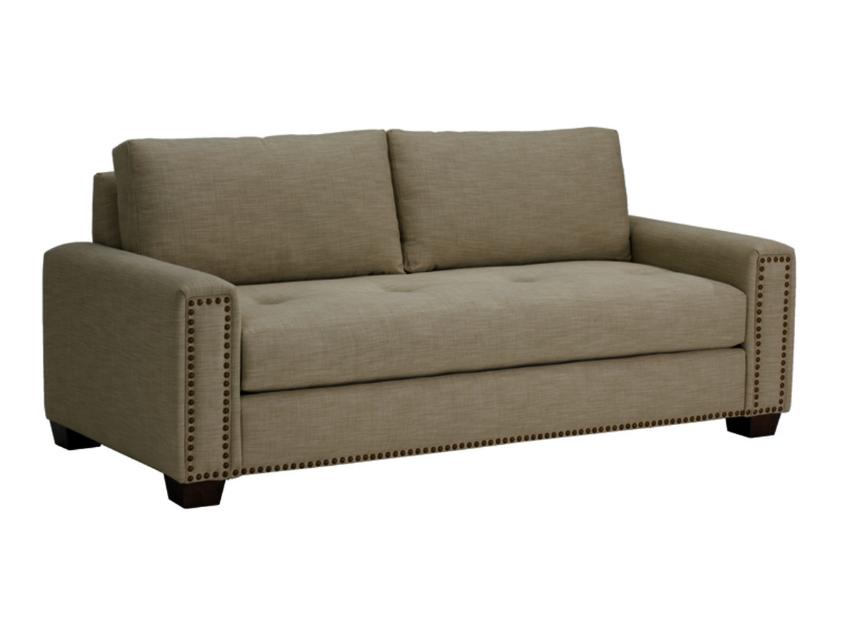 The thompson is our transitional style with 8" arms. We have trimmed them and the base with nailheads. The bench seat cushion is pull tufted with 2 loose back cushions.